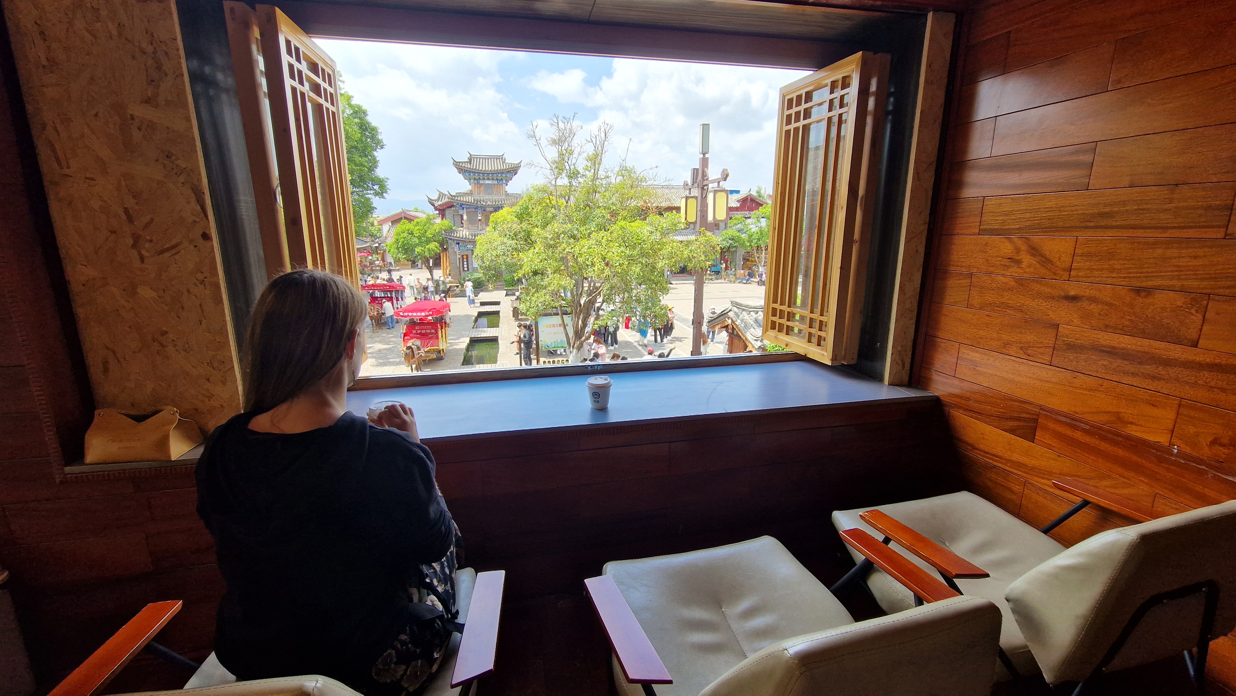Le problème, c'est qu'on est arrivés à Lijiang par le train vers 7h du mat, et du coup, rien n'était ouvert. On a vu les enfants aller à l'école... Tout le monde nous dit "hello", c'est drôle. Aucune idée de comment ils nous reconnaissent. On se pose dans le seul café ouvert, Starbucks. Ça a été quasiment la seule touche américaine qu'on ait vue pendant notre voyage en Chine, et honnêtement, ça fait du bien.